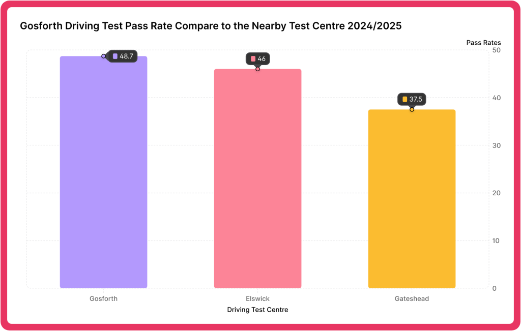 Gosforth Driving Test Centre has a moderate pass rate of around 48-49%, with the most common reasons for failure including not observing speed limits and poor lane discipline.